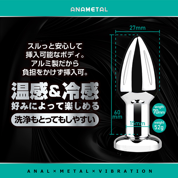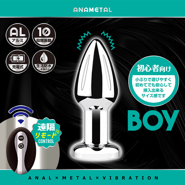遠隔リモートプレイが可能なアナル用メタルプラグ。高品質のアルミニウム製で、表面がつるつる滑らか。挿入感もとっても心地良く、扱いやすさも抜群。冷水や温水につけて、時にはひんやり、時には温かく、好みに合わせて楽しめます。遠隔式なので1人でも2人でも様々な遊び方が可能です。<BOY特徴>小ぶりで遊びやすく、初めてでも安心して挿入出来るサイズ。初心者はまずこれ。・10段階振動・遠隔操作(操作飛距離8m)・本体生活防水(リモコンは防水ではありません)。充電時間:約40分/連続使用時間:約60分※温冷機能ではございません。