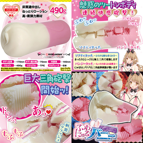 魅惑のツートンボディで連続快感砲撃!W素材でWの快感。ふわりガツンっ!にゅるりガツンっ!前後ダブルで巨大三角砲撃開始。あっ!と声も漏れちゃう、もふもふタイム突入!前半ソフティタッチはとろける様な柔らかさ。まったりとじっくりと極上三角で愛撫します。後半のバンジータッチはもっちり柔らか高弾力。にゅるりんゾリゾリと三角砲弾刺激が襲います。