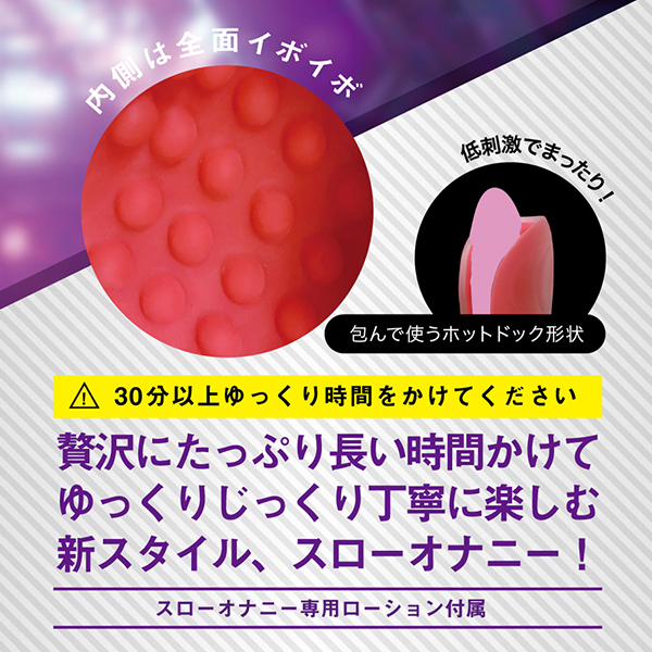 時間を掛けて限界を超える。スローオナニー専用オナホール「ズリセン」!あなたは、「スローオナニー」という言葉を知っていますか?贅沢にたっぷり長い時間をかけて、ゆっくりじっくり丁寧にプレイを楽しむ、それがスローオナニー。「ズリセン」は、そんな新しいプレイスタイルのために生まれたオナホールです。挟み込むホットドッグ形状と、まったり刺激とで、スローオナニーをサポートします。貴男をパックリと挟んで包むホットドッグのパンズような形状が特徴的です。通常のオナホールにある挿入行為が不要で挟むんでコスるだけで楽しめるのでビンビン状態でなくても使用可能。半ビン状態から優しいアプローチで、ゆっくりと気分を高めることが出来るのです。長い時間を楽しめるよう、まったりとした刺激も特徴的。最初は優しくスリスリ、盛り上がってきたら裏をズルズル、さらに高まってきたら頭をグリグリとまるで磨き上げるようにじっくり楽しめます。焦らすようにジワジワと快感を貯め込むことでフィニッシュ快感は遥かな高みに到達するはず。すぐにフィニッシュを求めず、そこに至るまでの刺激を楽しみ続け、より深い快感を目指す贅沢な流儀。それが新しいスタイル、スローオナニーなのです。強い刺激やビンビン持続も必要ないので、「早さ」や「タフさ」のトレーニングにも!?「イボ」は、大きなイボイボ突起がびっしり配置されたデコボコ快感。弾力たっぷりな肉感素材。クリアカラーに包まれたビビッドなレッドカラーが絶妙な高級感を演出。手コキと相性ぴったりなツブツブのまったり刺激をお楽しみください。