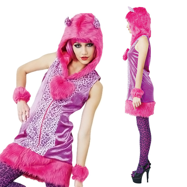 人とかぶらない個性的なハロウィン仮装をお探しの方に!フューシャピンクのビビッドなカラーが注目度抜群な、可愛いヒョウ柄の悪魔コスプレ。獣感のあるもこもこファーのフード付ワンピースとファーブレスレットで、全身をド派手にコーディネート!近未来から来たようなデザインが可愛いデビル仮装です。※水洗い不可、塩素系漂白剤、アイロン、ドライクリーニング不可、色落ちの可能性があります。※こちらの商品は在庫の状況によりお届けまでに4日〜7日程度かかる場合がございます。