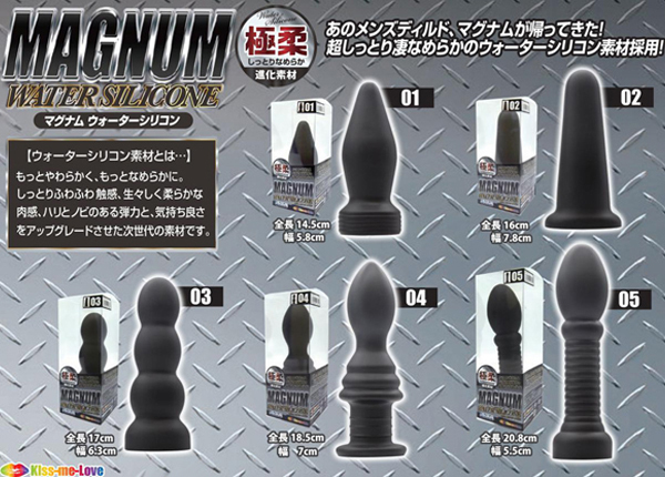ブラックが冴えわたる本格派ディルドが最新素材になって新登場!極上素材を採用した「マグナム ウォーターシリコン」!黒い欲望を満足させるエキスパートなボディライン。その魅力をそのままに素材をグレードアップしました。シリコンを超える進化素材。超しっとり凄なめらか快感度を追求した進化素材、それがこのウォーターシリコン素材なのです。しっとりきめ細やかな質感に生々しい生体的な肉感弾力、人体や環境にも優しい安心材料。アダルトグッズのステージを高めべく進化したマテリアルです。熟練者向けのマニアな形状に極上の肉々しさをプラスしたゴージャスなディルドです。調教や拡張などのハードコアでエクストリームなプレイにぴったりなシリーズとなりました。「MAGNUM」の名の通りパワーあふれる快感をご体験ください。「01」は、太さ5センチの弾頭型フォルム。コンバットなデザインが興奮を煽る!